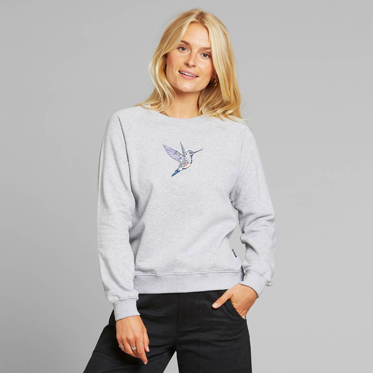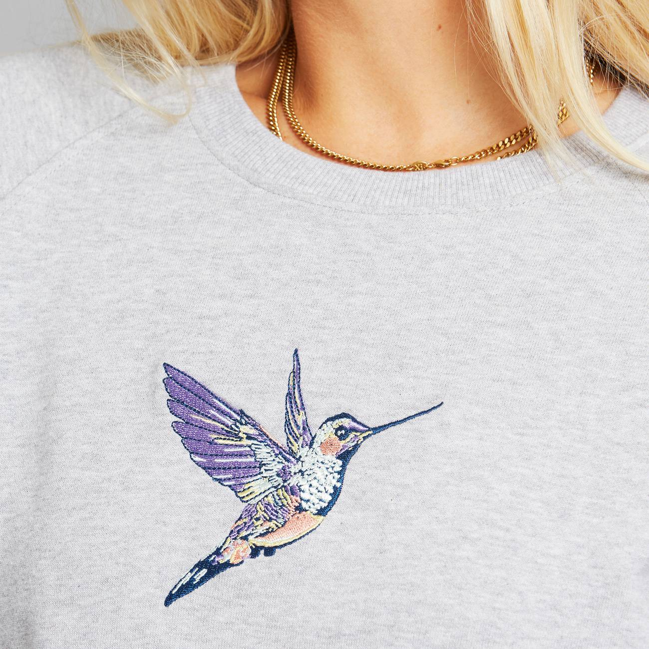 Girocollo, inserto ricamato nella parte anteriore. Maniche reglan. Scollo, polsini e fondo arrotondati a costine.