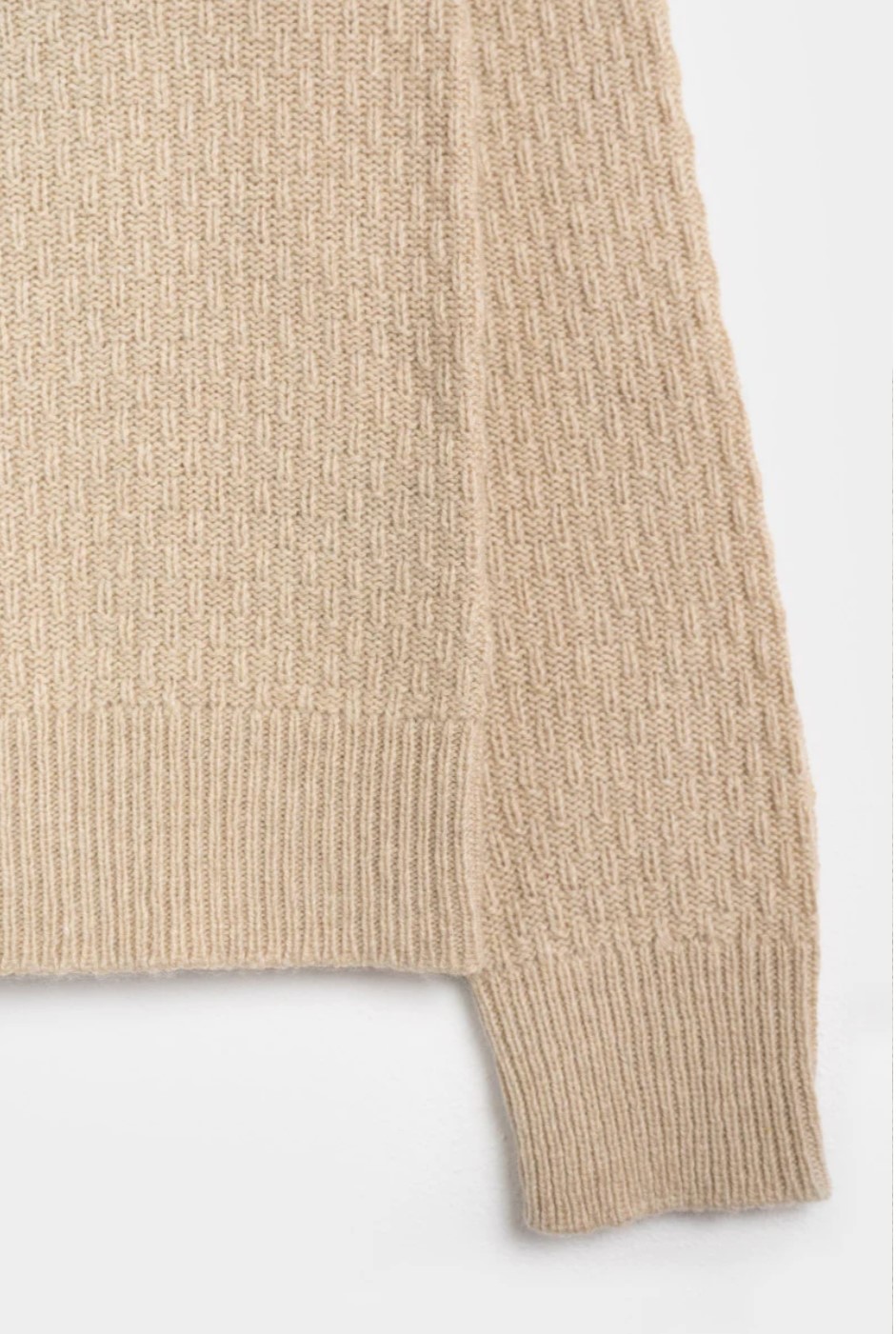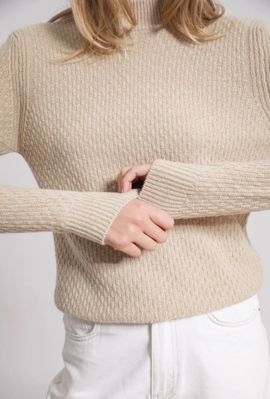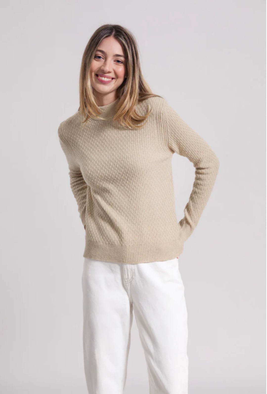 La maglia in cashmere rigenerato Caterina pesa 230 gr ed è stata realizzata con uno speciale punto chiamato doppio chicco di riso, che dà risalto e brillantezza ai colori del cashmere rigenerato.