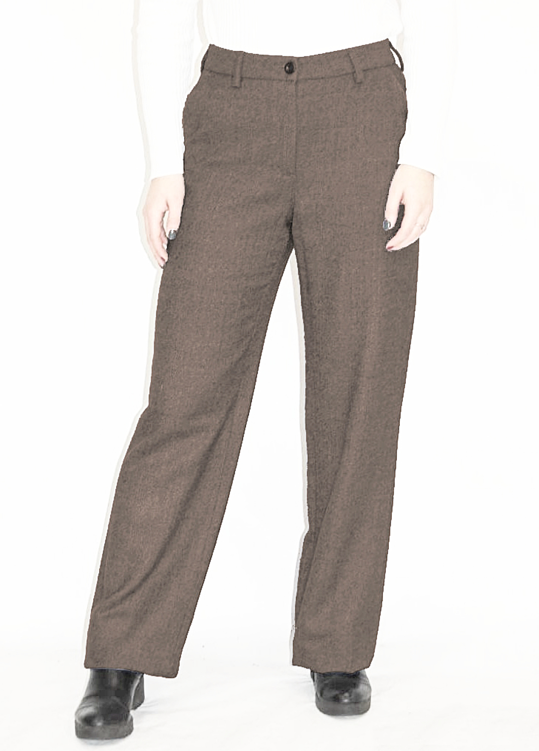 Pantaloni caldi e confortevoli, in 100% lana vergine. Taglio dritto, tasche ai fianchi e a motivo decorativo sul retro. Chiusura con bottone e zip.