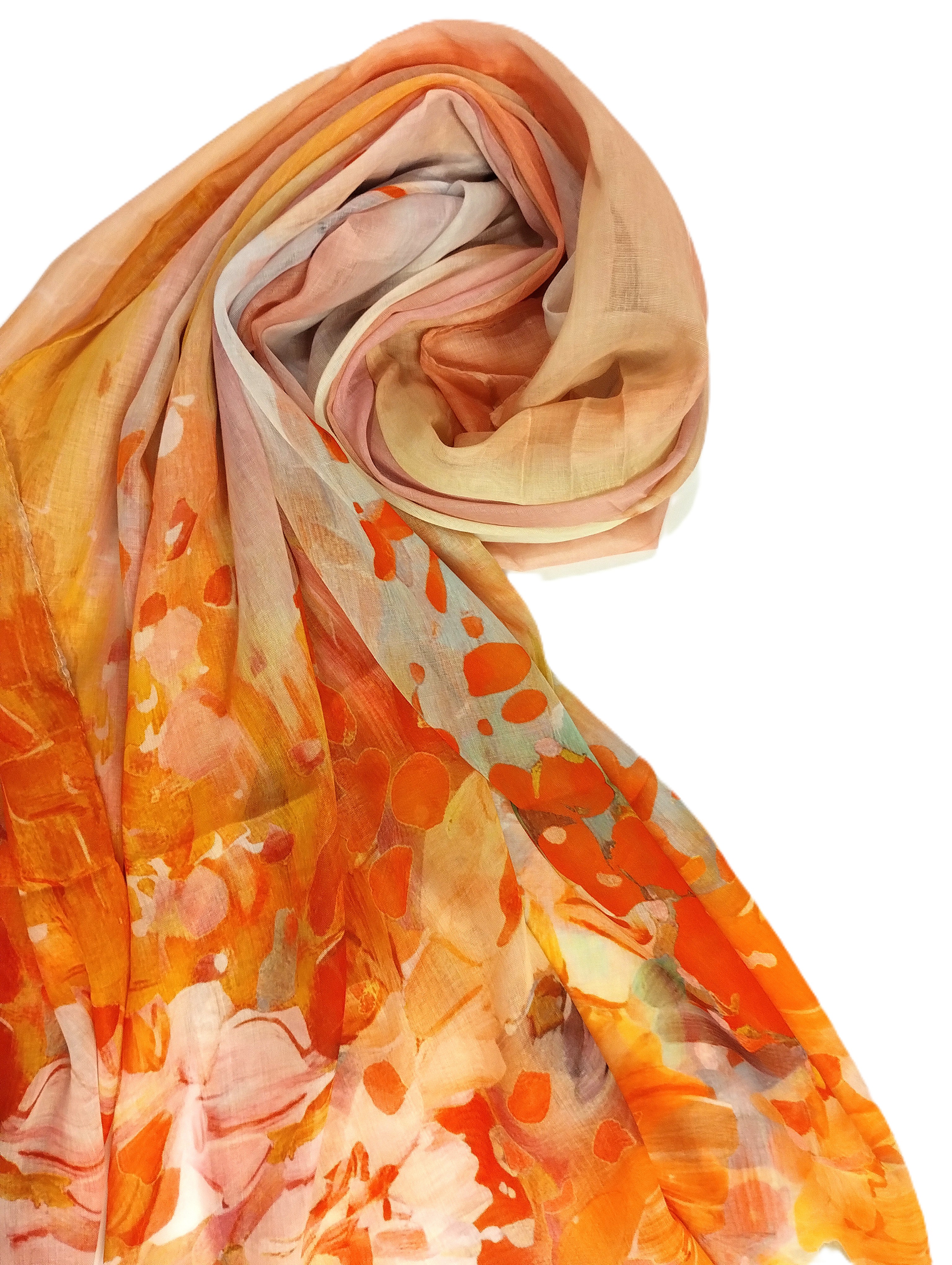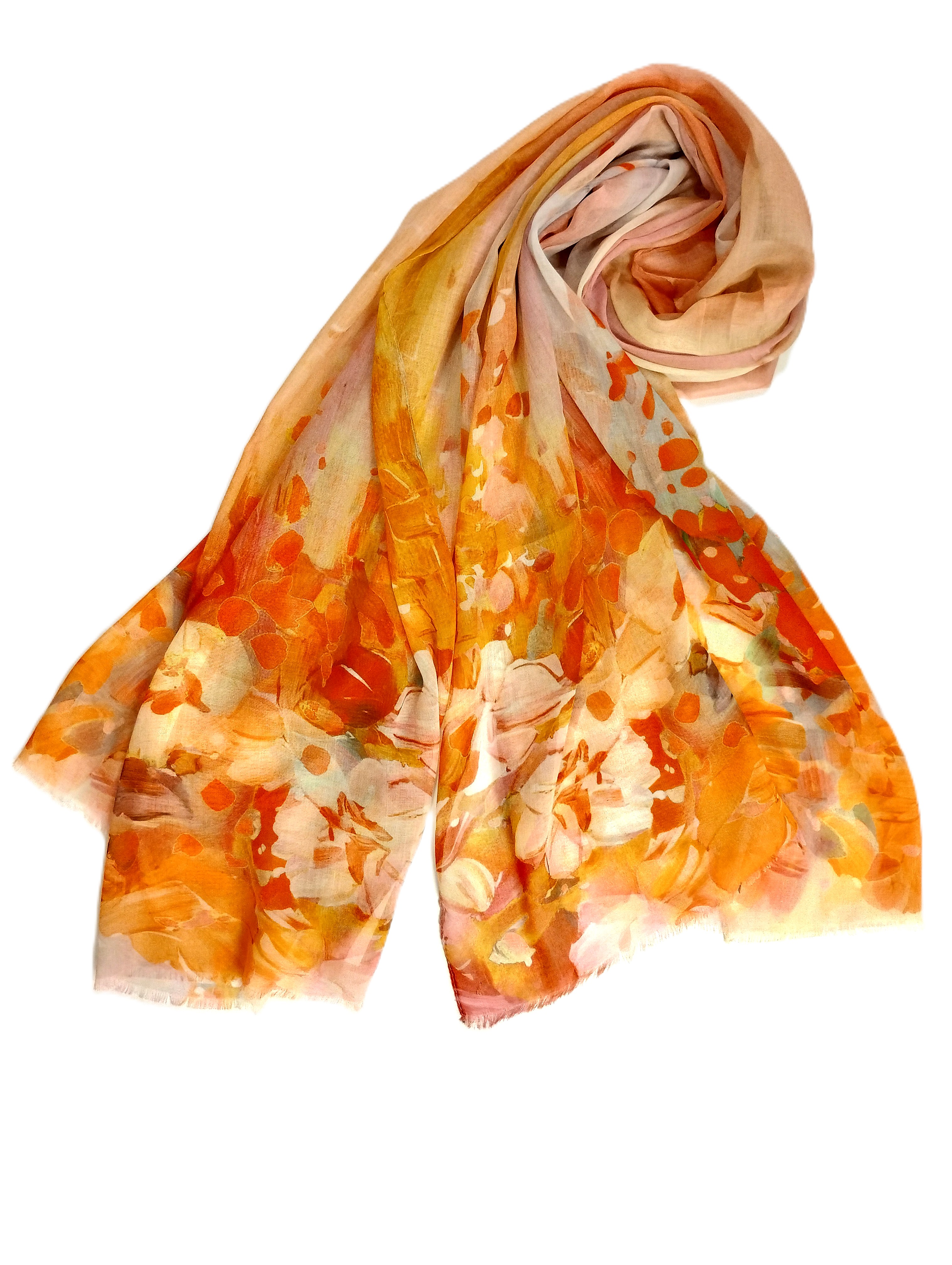 Questo foulard in ecovero e cotone biologico, con una misura di 180x90 cm, è un accessorio che unisce eleganza e sostenibilità. La sua stampa floreale nei toni vivaci dell'arancione e del giallo evoca la gioia dei fiori in piena fioritura, portando un tocco di freschezza e vitalità al tuo guardaroba.
